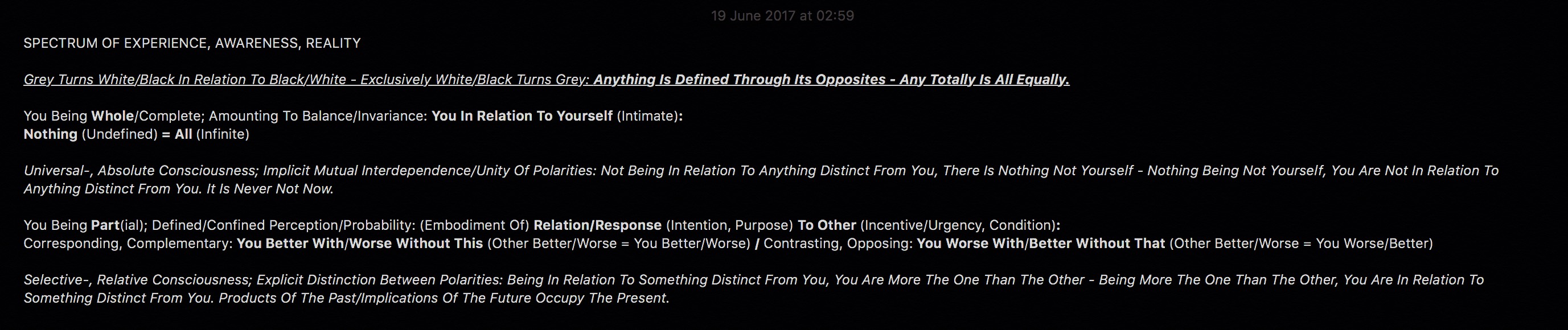 Universal-, Absolute Consciousness; Implicit Mutual Interdependence/Unity Of Polarities: Not Being In Relation To Anything Distinct From You, There Is Nothing Not Yourself – Nothing Being Not Yourself, You Are Not In Relation To Anything Distinct From You. It Is Never Not Now.